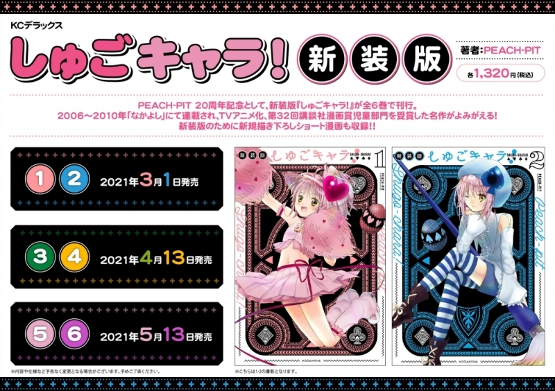 しゅごキャラぷっちぷち! 3 税込価格 2,940円 発売 第25話〜36話収録 しゅごキャラぷっちぷち! 4 税込価格 3,360円 発売 21年08月23日 『しゅごキャラ! 』グッズ通販サイトがオープン! 『しゅごキャラ! 』(PEACHPIT)連載15周年記念! ここでしか買えないグッズもたくさん登場! 『しゅごキャラ! 』の世界にひたっちゃおう☆ ぜひ遊びに来てね!しゅごキャラ!シールえほん 1 税込価格: 750円 0801発売 講談社おともだちシールブック ガチャ「しゅごキャラ!マスコット」 税込価格:各 0円 0712 発売 「ラン」「ミキ」「スゥ」「てまり」「キセキ」「ヨル」の6種類。 しゅごたま型のプレート付き。